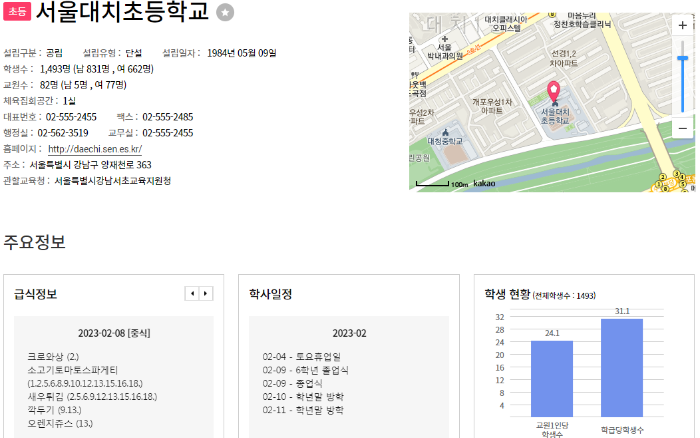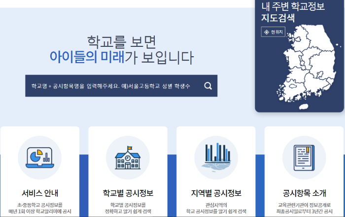 자녀들이 새롭게 초등학교, 중학교, 고등학교에 진학하는 경우 각 학교의 대략적인 정보들은 '학교 알리미'라는 사이트에서 확인할 수 있다. 학교 알리미 홈페이지에서는 전국에 있는 초, 중, 고의 대략적인 정보를 확인할 수 있다. 검색창에 학교 이름을 검색해도 좋고, 화면 우측 지도에서 지역을 선택해 학교를 선택하여 검색할 수 있다. 이곳에서는 급식 현황, 학사 일정, 학생 현황 등을 확인할 수 있다.